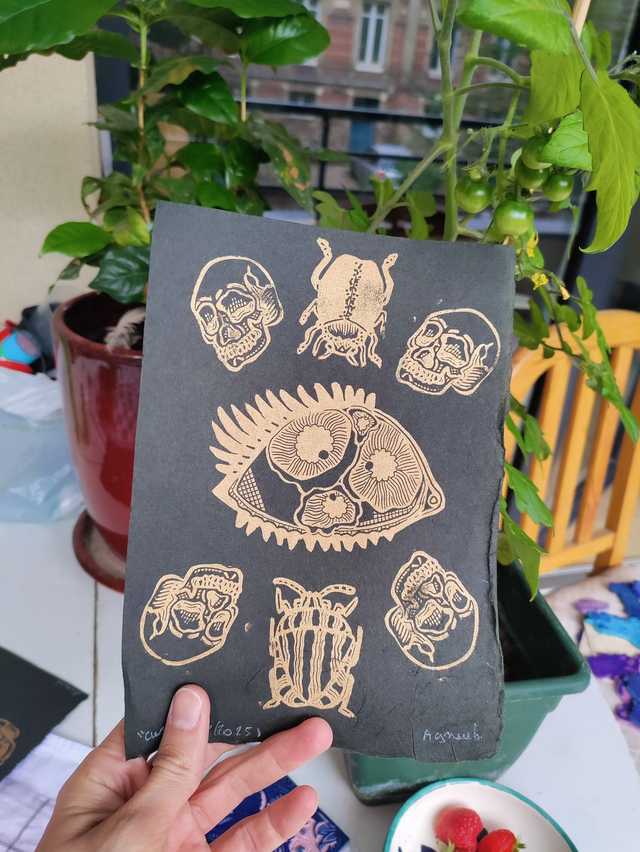 -les Impression sont réalisées manuellement, ce qui signifie que chaque impression est unique et peut présenter des particularitées qui diffèrent d'une impression à l'autre. ( légère différence d'encrage par endroit d'une impression à l'autre).