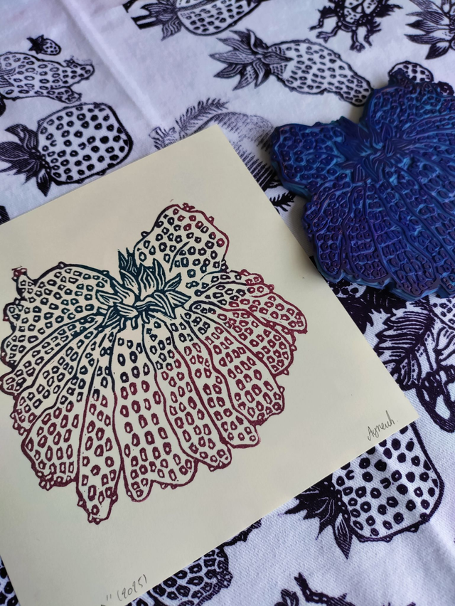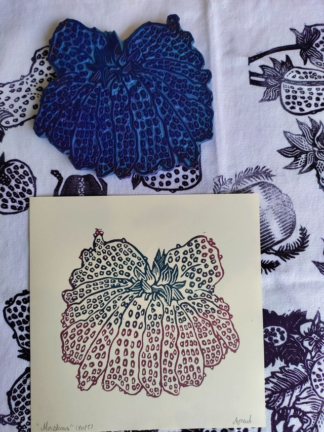 impression linogravure fraises étranges "Monstrous" bicolore 15X15cm