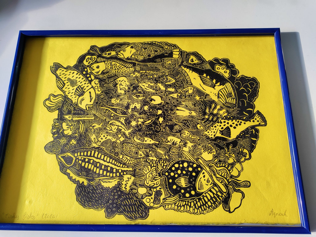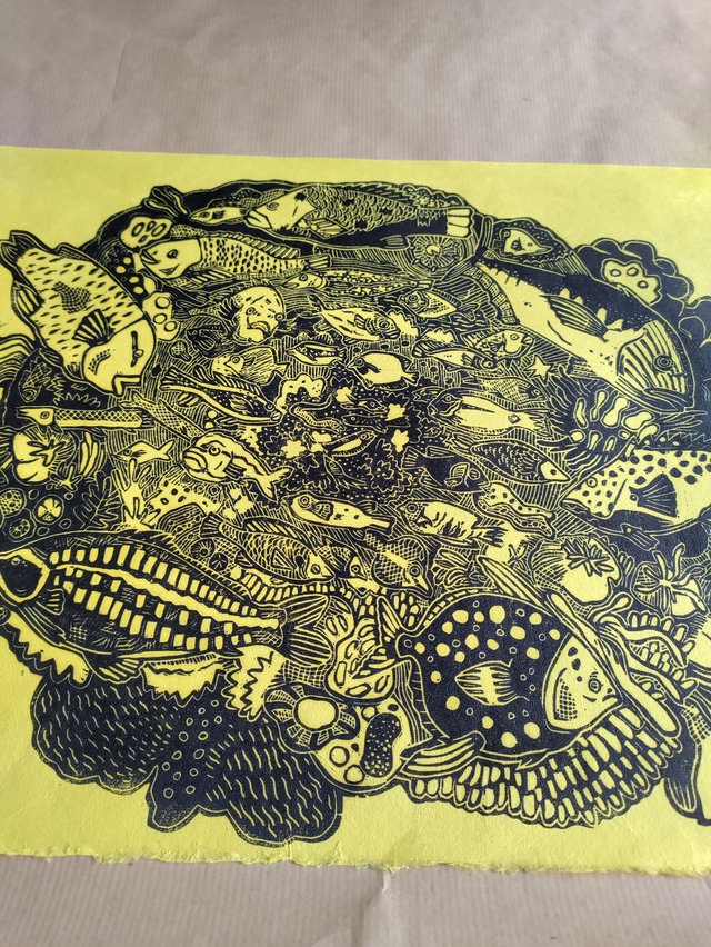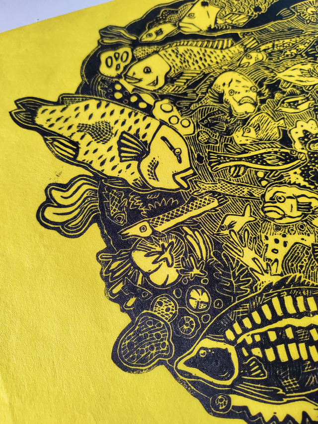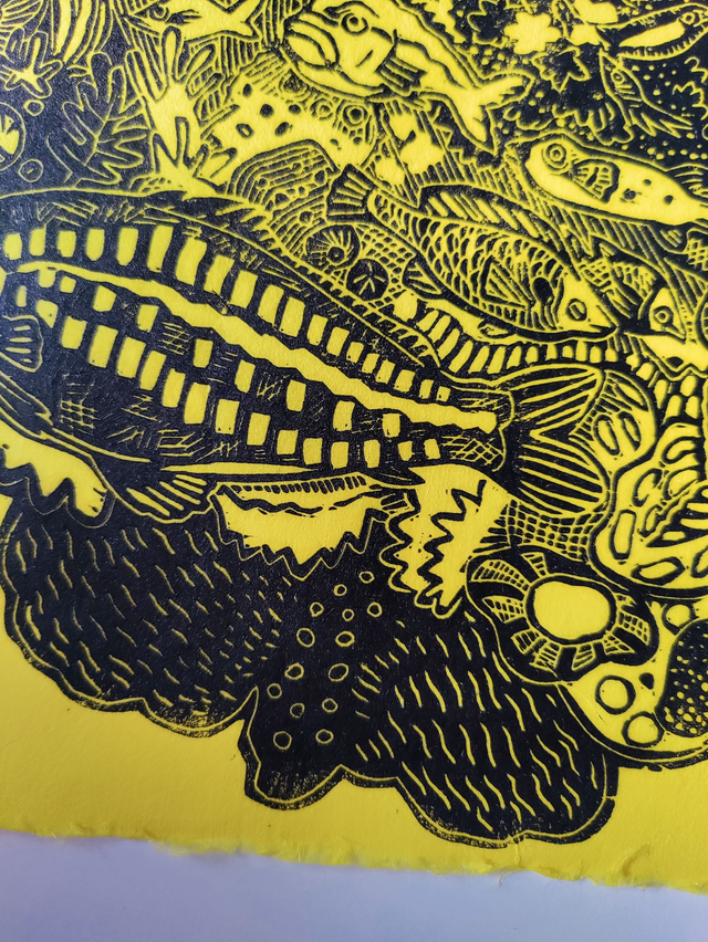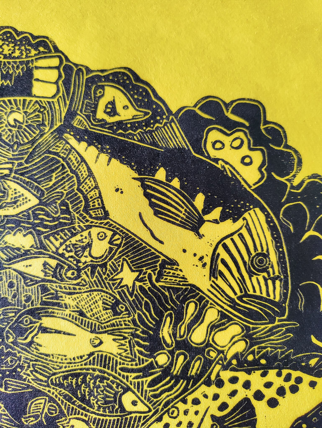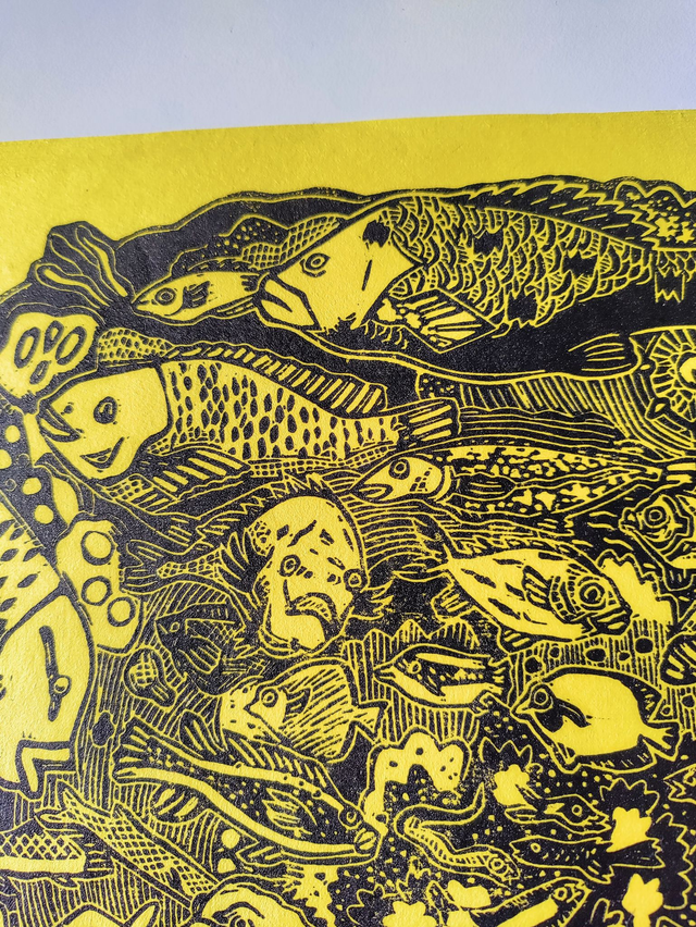 linogravure "Fishy fishes" jaune