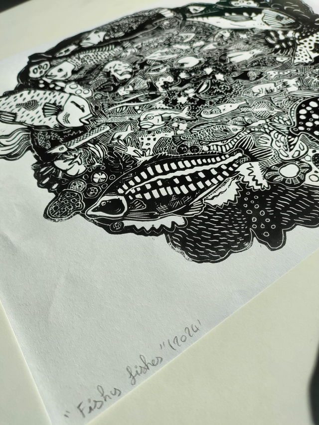 Linogravure poissons format A3 impression noire sur blanc