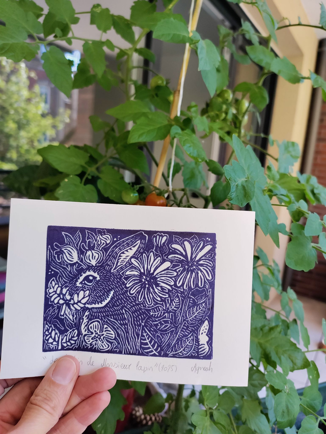Linogravure lapins sauvage "le festin de Monsieur lapin"
